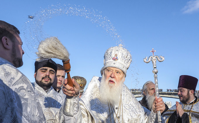 Почетный патриарх Православной церкви Филарет традиционно провел богослужение во Владимирском соборе и освятил воды Днепра возле Гидропарка, предстоятеля ПЦУ Епифаний провел богослужение в Михайловском соборе.