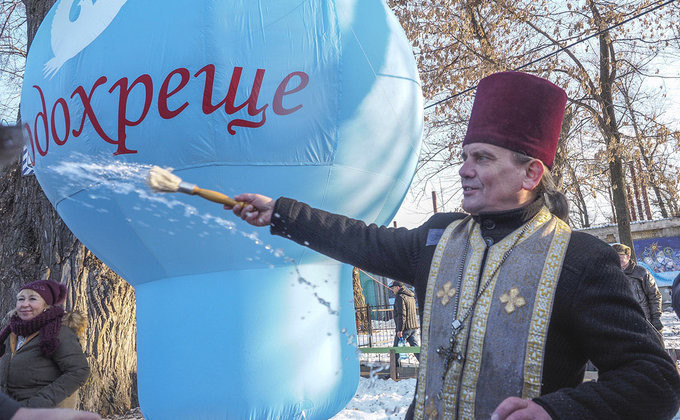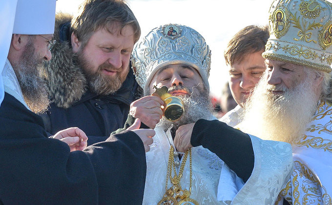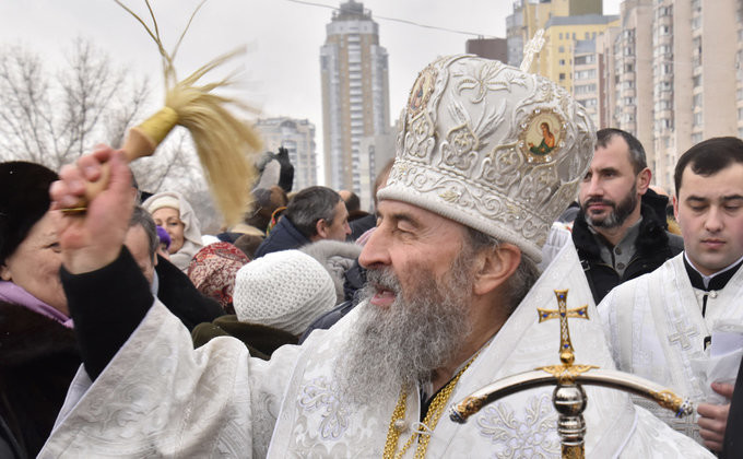 Глава московского патриархата митрополит Онуфрий, как и в предыдущие годы, провел обряд возле Свято-Покровского собора на Оболонской набережной.