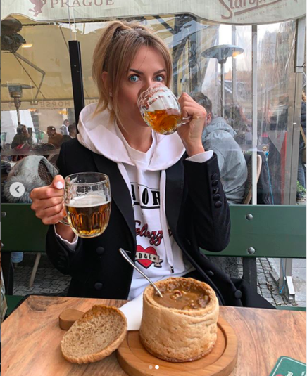 32-летняя телезвезда опубликовала в Instagram новые фото, сделанные в Праге. На одном из снимков Никитюк позирует с бокалами пива и традиционным чешским супом в хлебе.