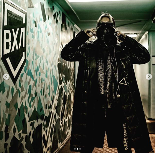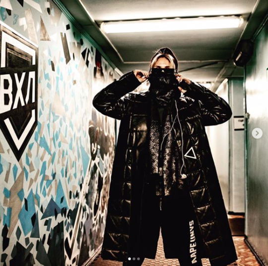 Перед камерой Лобода появилась в странном образе, она, как всегда, кривляется на камеру. На ней черный спортивный костюм, поверх которого певица накинула черный пуховик, на ее голове черная шапка, половина лица скрыта шарфом, а на глазах темные очки.