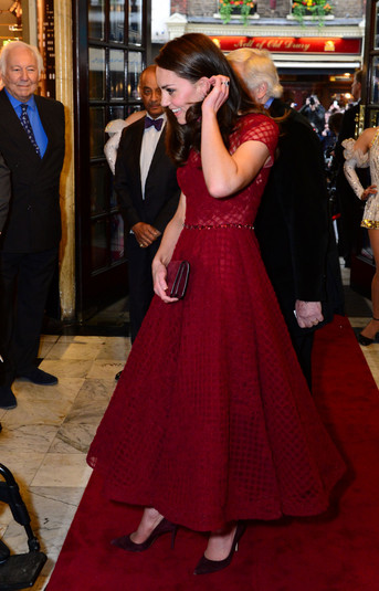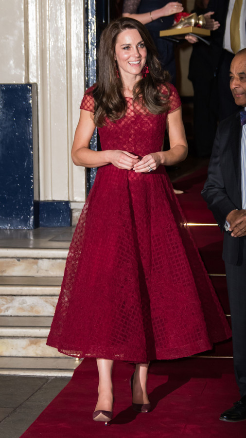 Для своего феерического появления Кейт выбрала платье-миди цвета марсала с кружевной отделкой бренда Marchesa, которое обошлось ей в 1 510 фунтов стерлингов. Подол платья красиво развивался, пока герцогиня следовала по ковровой дорожке ко входу в театр.