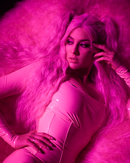 Розовый цвет полностью преобладает на снимке - парик с хвостиками, тени на глазах, жвачка, одежда, задний фон. Оттеняет розовое изобилие только подводка глаз - она черная.