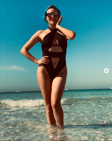 Исполнительница примерила цельный черный купальник оригинального кроя - с откровенными вырезами в районе груди и живота.