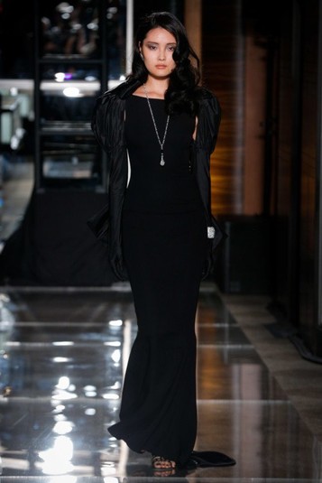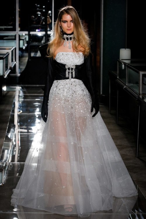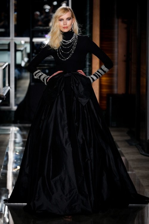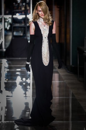 Платья украшены черными бантами и дополнены длинными перчатками. Силуэты сшили из атласа и кружева. Юбки покрытые тонкими слоями французской сетки. Наряды выполнены в черных цветах усыпаны драгоценными украшениями. Объемные рукава-фонарики оттеняют изящные приталенные силуэты.
