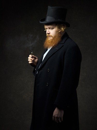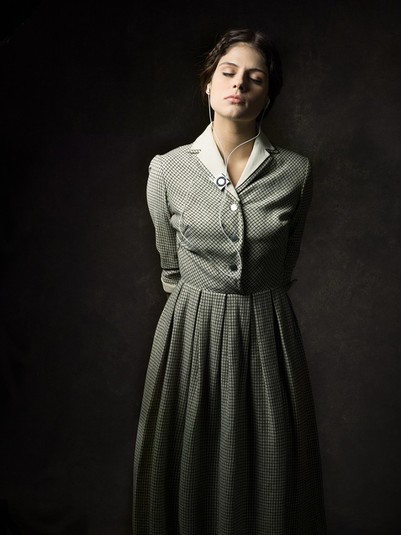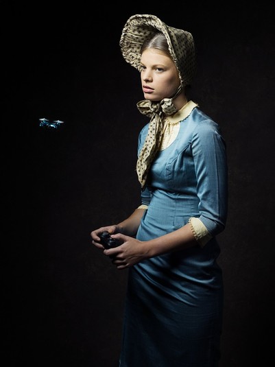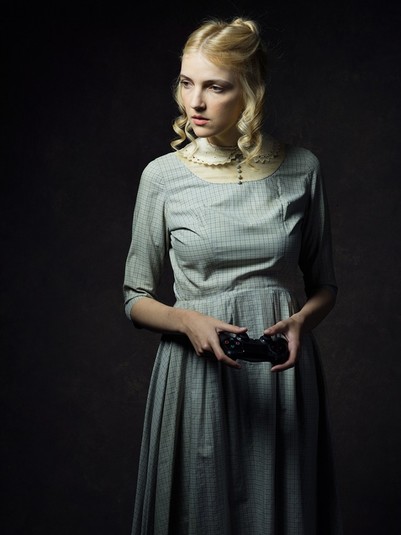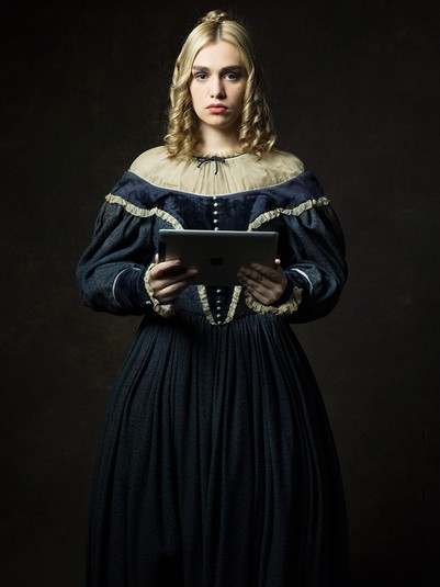 Модели, принявшие участие в проекте, позируют фотографу в нарядах 19 века с гаджетами, которые являются неотъемлемой частью жизни современных людей, например, iPad, электронной сигаретой или наушниками.
