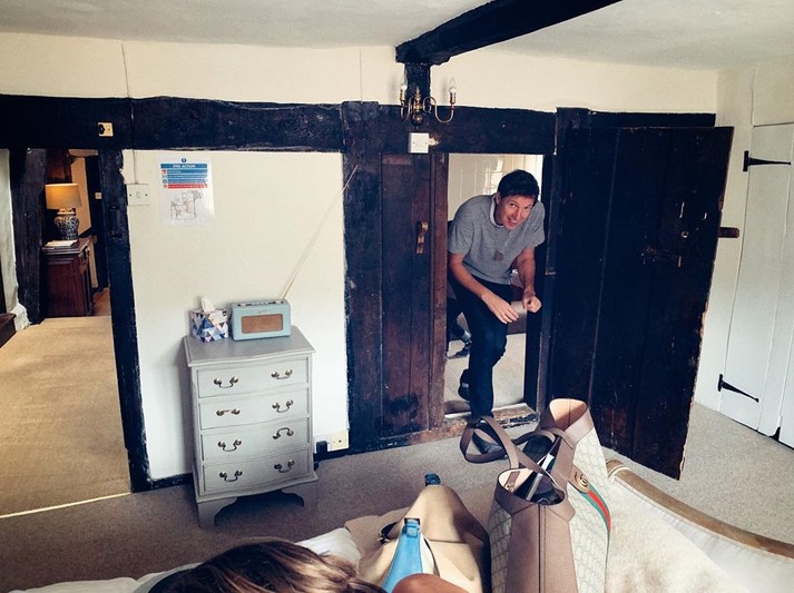 «Мы остановились в великолепном доме XV века в Лэкоке, где не могли пройти в другую комнату, не присев. На фото вы можете видеть моего высокого мужа, пытающегося пройти через дверь ванной, чтобы помочь нашей четырехлетней дочке помыть руки, и это довольно весело!»
