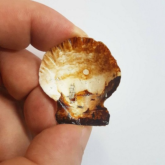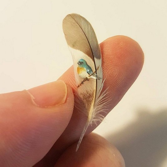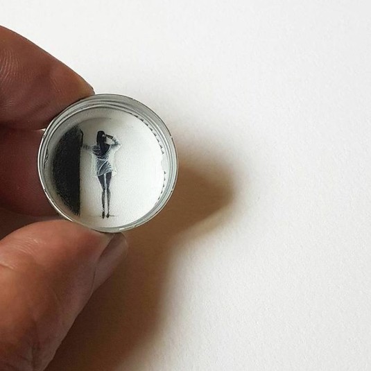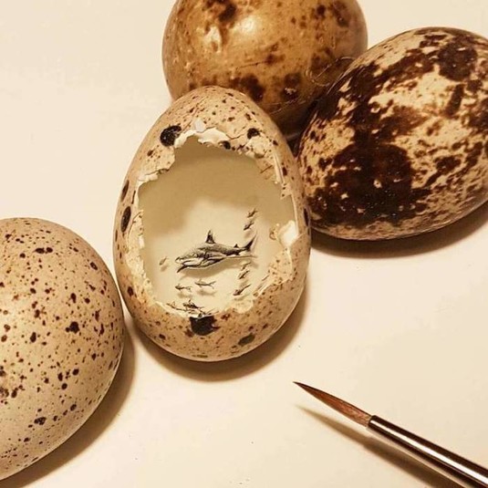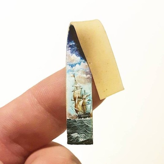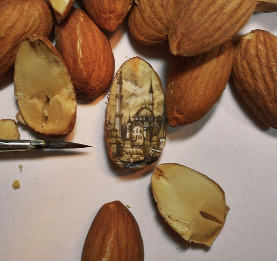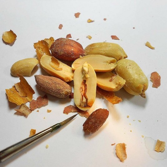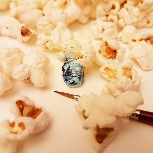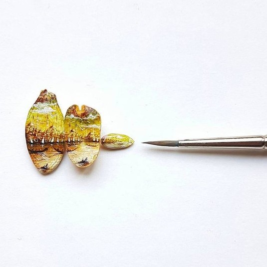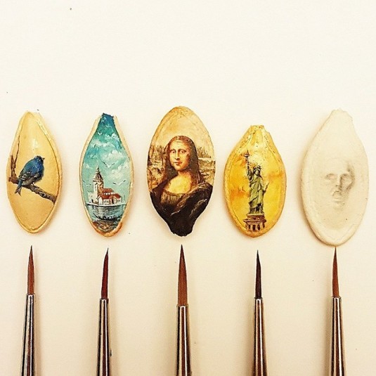Основой для его работ может служить всё, что угодно, начиная от крышечки из-под Кока-Колы и заканчивая кусочком молочного шоколада, отломившегося не так, как хотелось бы. Чтобы нарисовать одну работу у художника уходит не просто множество часов, но и несколько дней, а порой целые недели, чтобы с особой тщательностью и вниманием отобразить каждую деталь и каждый штрих. Это своего рода удивительная, почти что ювелирная работа, когда на тыквенном семечке с помощью крошечных кистей проявляется американская Статуя Свободы, а на крыльях бабочки – целый город, крыши домов которого сияют сусальным золотом.
