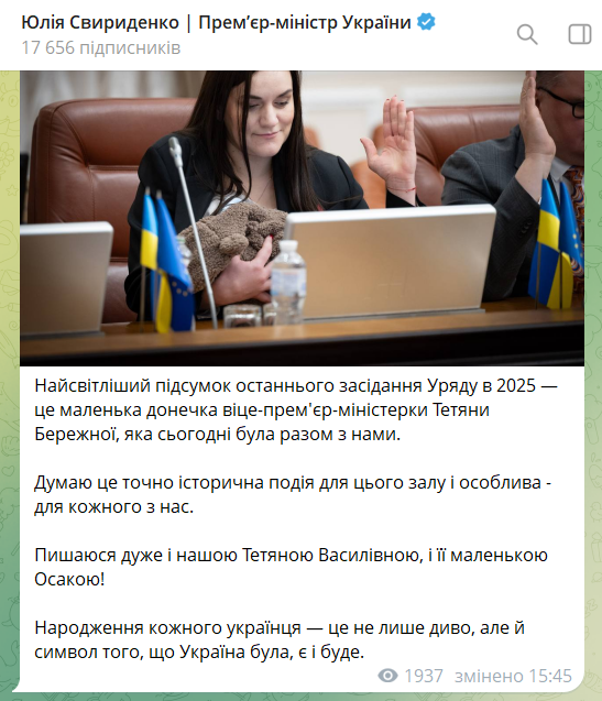 «Найсвітліший підсумок останнього засідання уряду в 2025 – це маленька донечка віцепрем'єр-міністерки Тетяни Бережної, яка сьогодні була разом з нами. Думаю це точно історична подія для цього залу і особлива – для кожного з нас», – йдеться у підписі до фото.