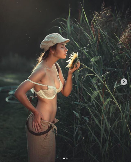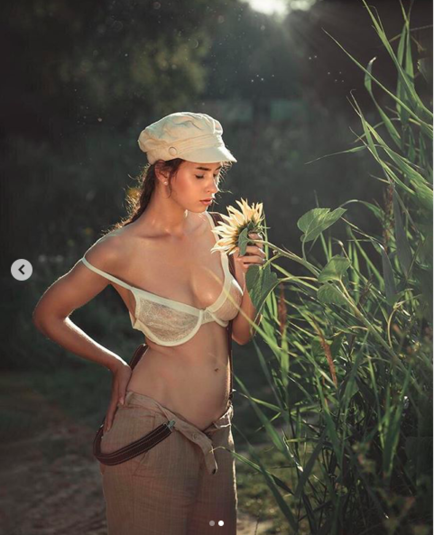 На фото девушка позирует в лучах вечернего солнца на фоне тростника и с подсолнухом в руках. Она одета в легкие льняные брюки бежевого цвета и нежный белый бустгалтер. Ее образ дополнили подтяжки и забавная шапка, которые и задают атмосферу всей фотосессии.