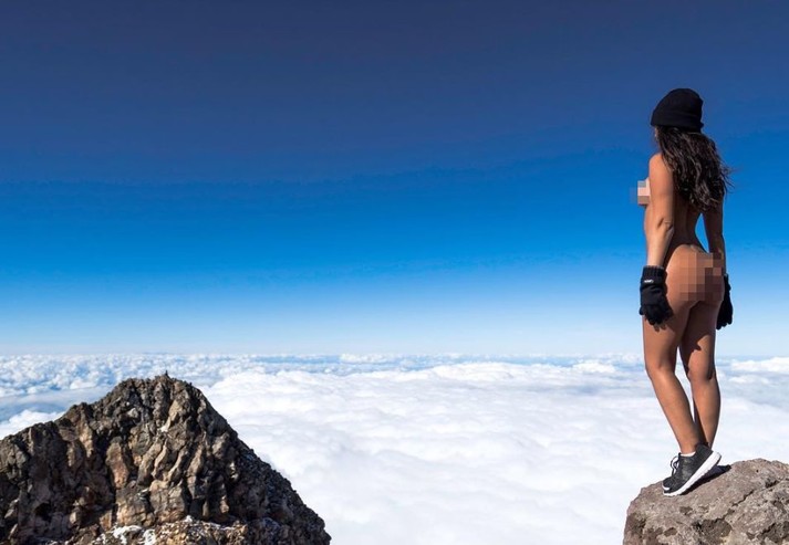Парочка опубликовала в Instagram фотографию, на которой девушка предстала в обнаженном виде (правда, перчатки и шапочку оставила, холодно все-таки) на фоне священного для маори места — вулкана Таранаки.