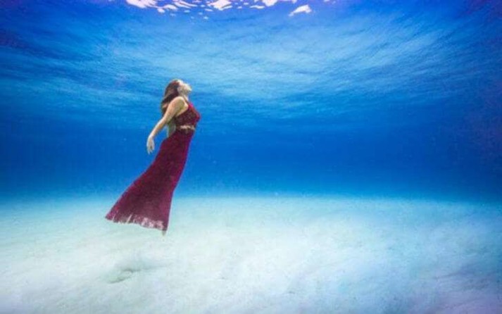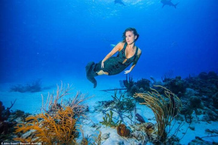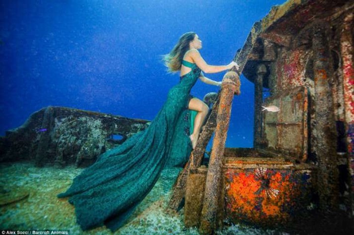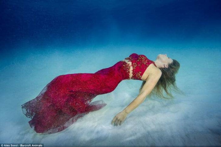 Глядя на эти снимки многие могут подумать, что это — результат искусной работы «фотошопера», а модель просто попозировала в красивом платье на зеленом фоне. Но это не так. Вся фотосессия реально проходила под водой, причем Карина не только спустилась на значительную глубину, но и проделала это без какого-либо специального снаряжения и позировала в окружении парочки опасных морских хищников — акул. На такие подвиги любительница животных пошла ради привлечения внимания общественности к бедственному положению акул.
