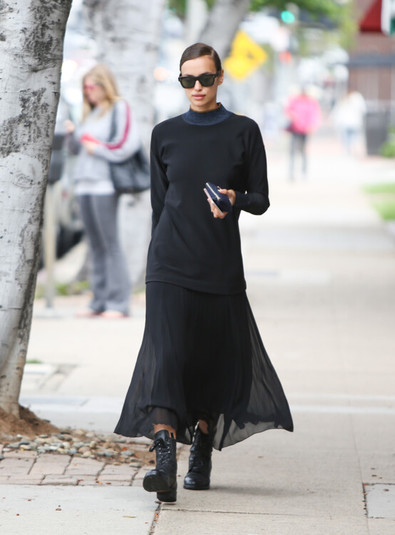 Практически каждый свой образ Ирина дополняет грубыми ботинками c контрастной строчкой Dr. Martens и темными солнцезащитными очками Celine.