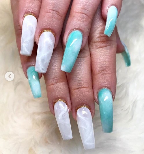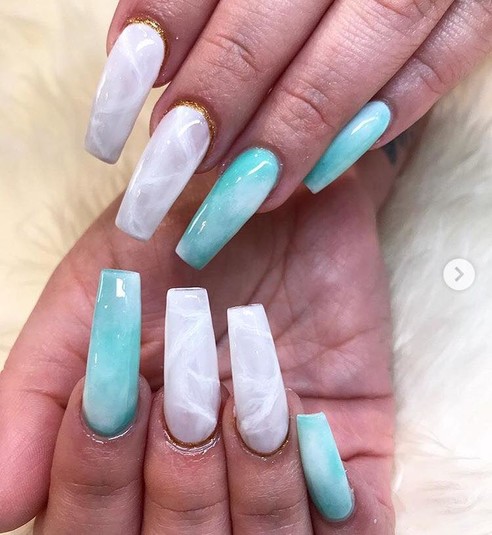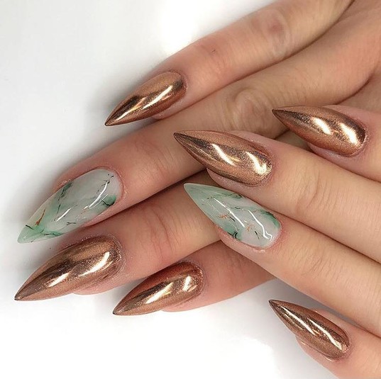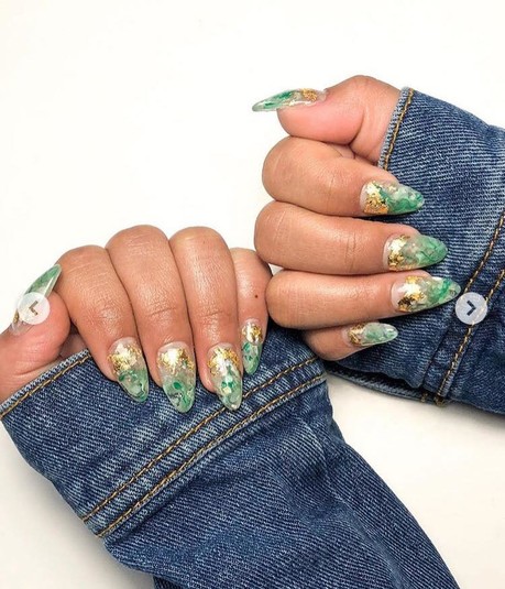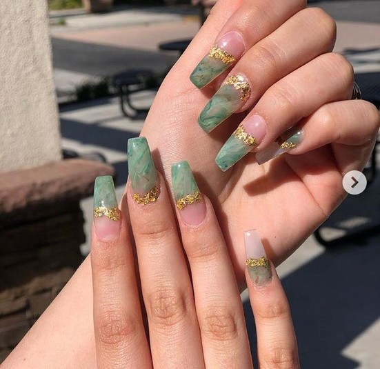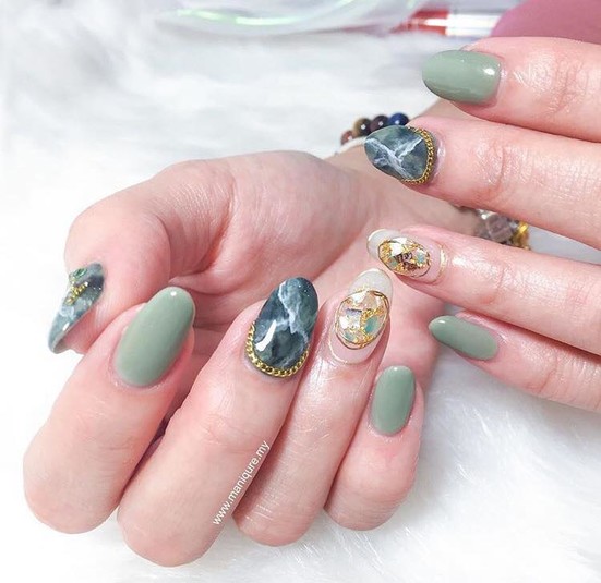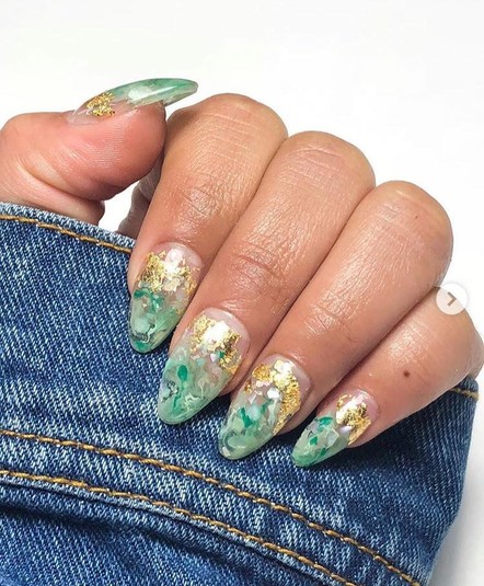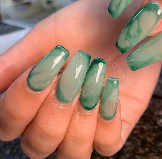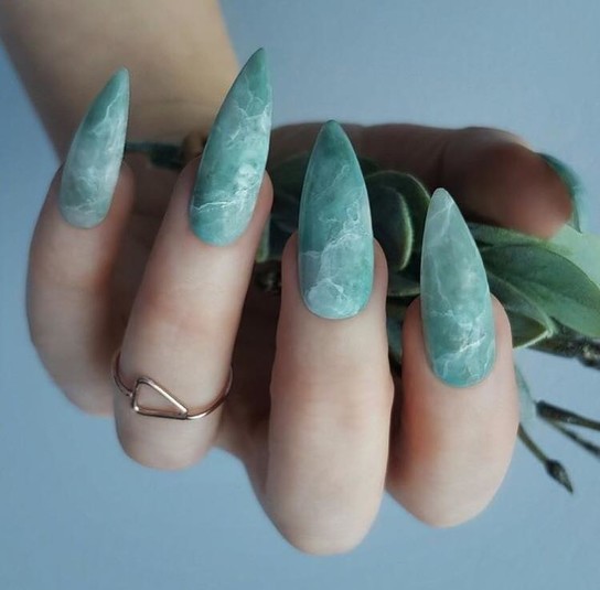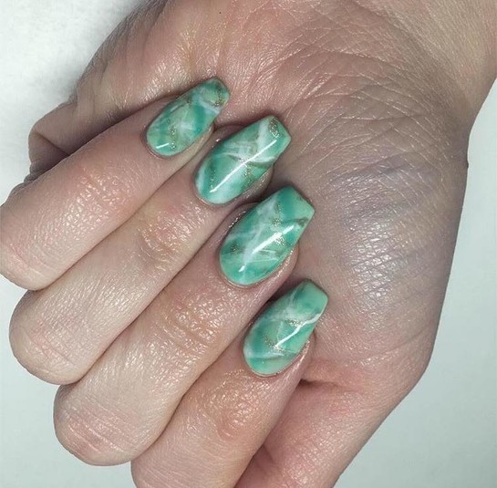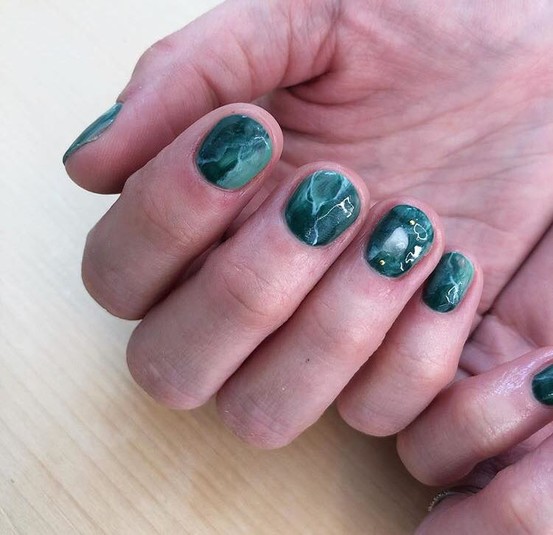 Ее маникюр выполнен в классическом оттенке – светло-зеленом цвете с темно-зелеными вкраплениями. Впрочем, эксперты ногтевого дизайна рекомендуют не ограничиваться зеленой цветовой гаммой и экспериментировать с оттенками, воплощая свои самые смелые идеи.