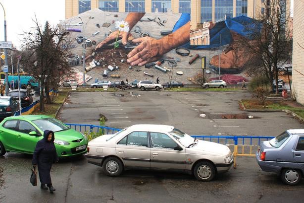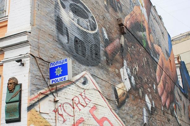 В Киеве появился первый в мире мурал, нарисованный на здании полицейского участка. Холстом для работы уличного художника стало Управление полиции Печерского района на улице Московской, 30. Рисунок получил название «Подняться из грязи».