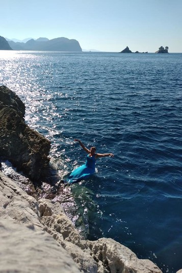 Странными фото она поделилась на личной странице в Facebook. На них она позирует в длинном бирюзовом сарафане. Примечательно, что купается в море Савченко также в нем, не переодеваясь в купальник.