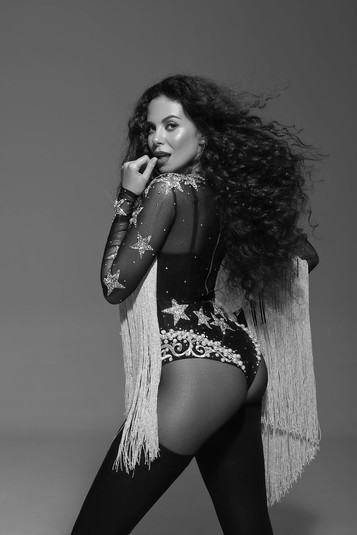 Для фотосета Настя примерила черное боди с множеством блестящих камней и звезд, которое сочетала с длинными чулками и белой длинной бахромой на рукавах.