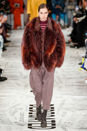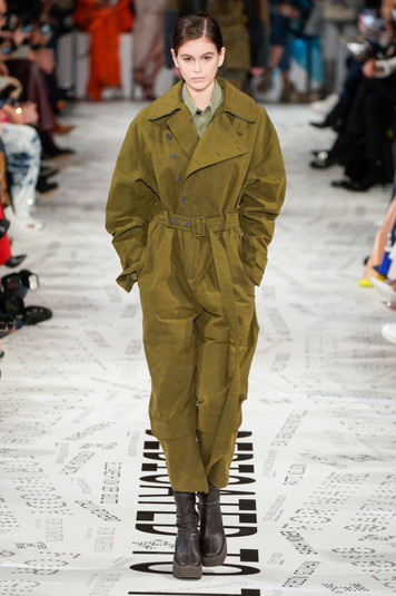Следуя своему верному пути Браун предложил три разных униформы для нового сезона: его фирменный костюм с брюками до щиколоток, буржуазный костюм с плиссированной юбкой и свободные платья-миди.