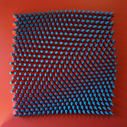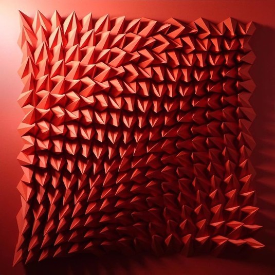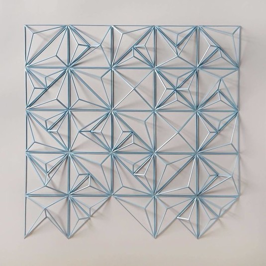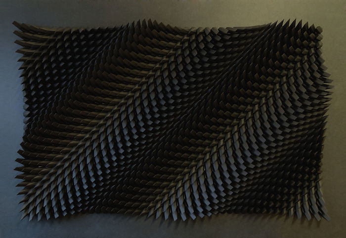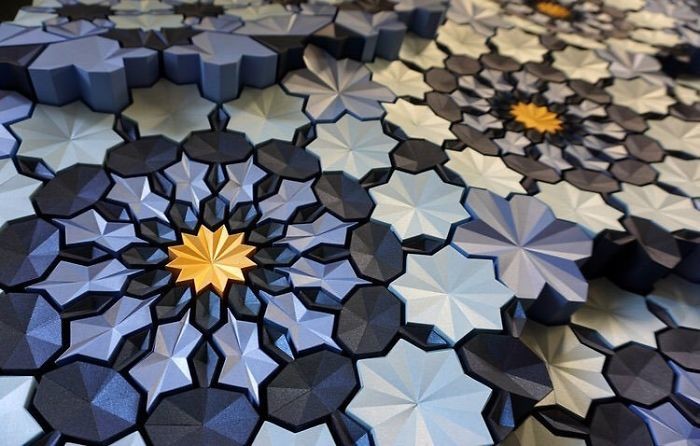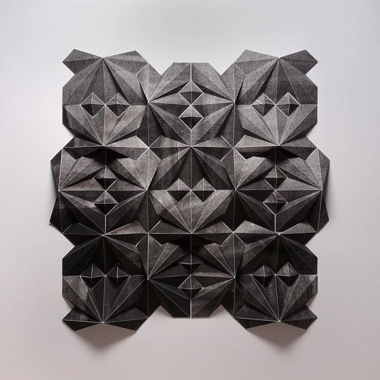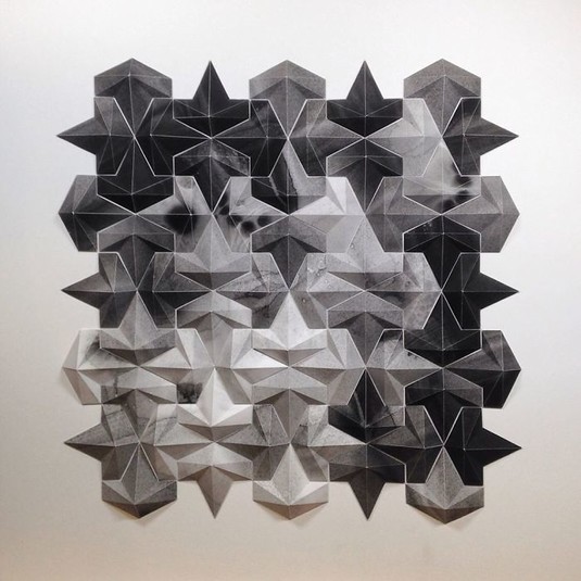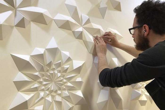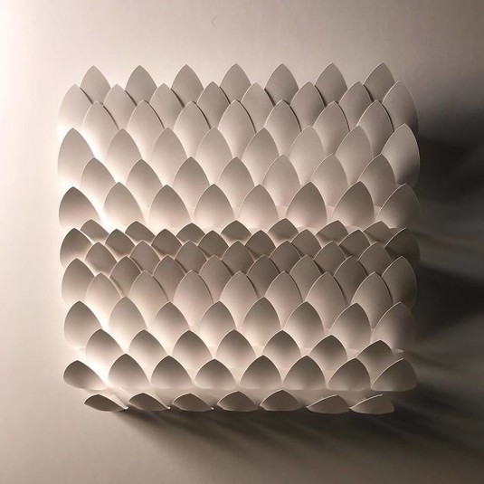 Повторяющиеся сложенные узоры скульптур Мэтью привели к его сотрудничеству с учеными из Университета Мичигана, и теперь они вместе работают над визуализацией исследований по переводу бумажных структур в микромир.