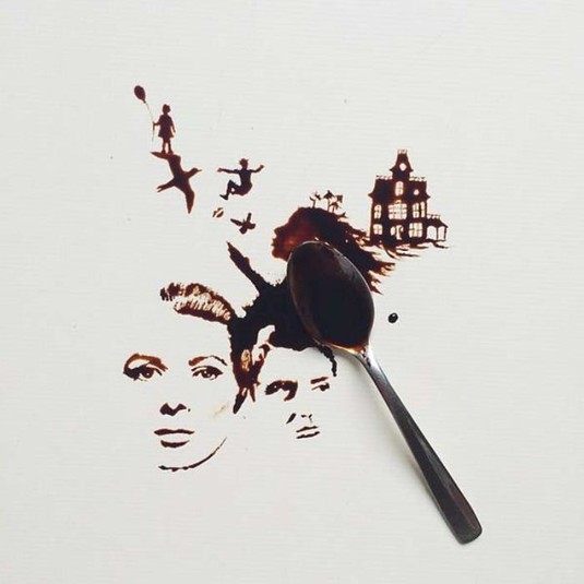 Джулия из тех художников, которые предпочитают «играть» со случайными кофейными пятнами на белой поверхности. Сначала она создаёт небольшой набросок из кофейной краски на листе бумаги, либо на дне чашки, после чего делает кадр вместе с опрокинутой или стоящей рядом чашкой. В итоге получаются очень интересные изображения, похожие на смесь живописи и фотографии. Самое удивительно то, что она избегает использования кисточек и других инструментов, которыми чаще всего пользуются художники. Всё, что ей необходимо – ложки, зубочистки и пальцы.
