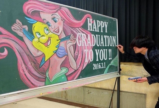 Преподаватель изобразительного искусства и графический дизайнер пишет мелом на классной доске. Каждый день студенты лицезреют новые картины.