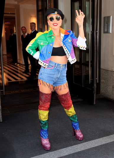 Гага появилась в радужном ансамбле, состоящем из жакета из денима, ботфортов, усыпанных разноцветными стразами Swarovski и микро-шортах с красочной бахромой из бисера. Госпожа Версаче выбрала белые брюки и белую футболку с радужными сердцами и завязала яркий платок на запястье.