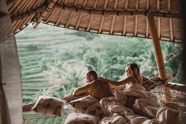 Свой рассказ Никита сопроводил живописными кадрами с любимой. Пара устроилась на балконе-гамаке с видом на тропические пейзажи. Влюбленные позируют среди подушек и белоснежных простыней.