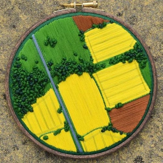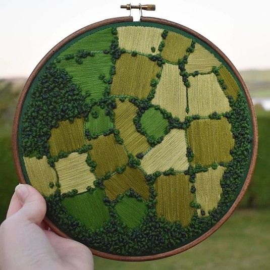 «Я вытащила немного хороших синих и зеленых цветов из старой оловянной вышивки моей бабушки и впервые отправилась в группу пейзажной вышивки в октябре 2018 года», – объясняет Ричардс.