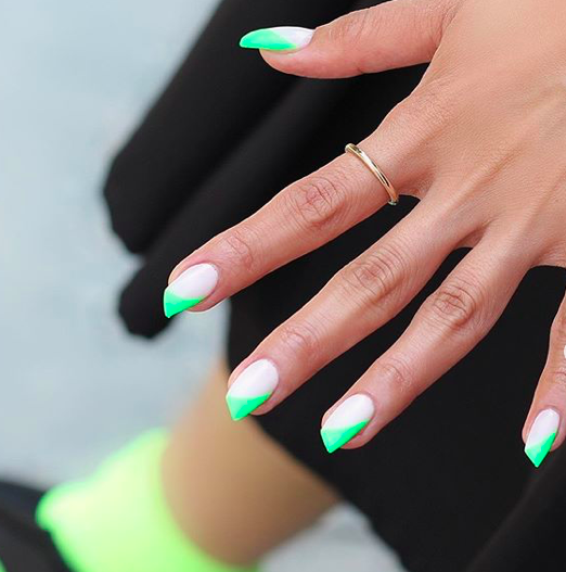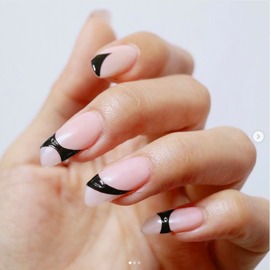 Маникюр получается оригинальным, в форме помады: переходит от короткого края к длинному. Такие ногти набирают популярность в сети, ведь все больше пользователей делятся своими идеями.