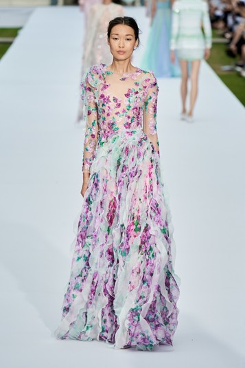 На подиуме модели появлялись в летящих образах из шифона всевозможных оттенков шербета, полупрозрачных платьях, обильно украшенных цветочной аппликацией, невесомых нарядах из тюля с каскадами оборок.