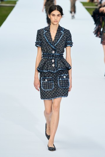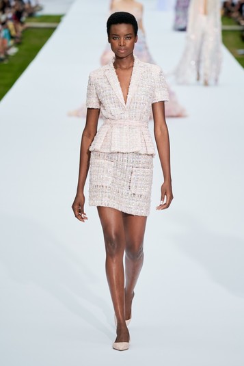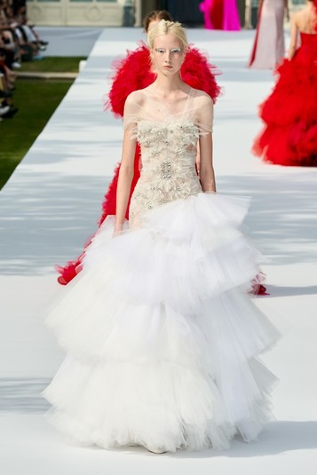Так, роскошные платья из атласа и тюля с длинным шлейфами и торжественным декором в виде перьев марабу и блестящих кристаллов соседствовали с твидовыми жакетами и мини-юбками из 1960-х годов – их дизайнеры предложили надевать с балетками в тон.