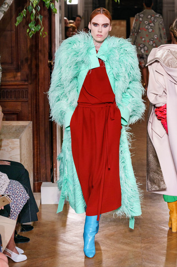 Великолепные и часто в удивительных сочетаниях – цвета и оттенки стали главными героями коллекции. Фирменные трапециевидные юбки в лимонно-зеленом и сливовом оттенках; бюстье в охре, сирени и фтористо-желтом; пернатые пальто и драпированные платья из крепа в кирпичном и аквамариновом.