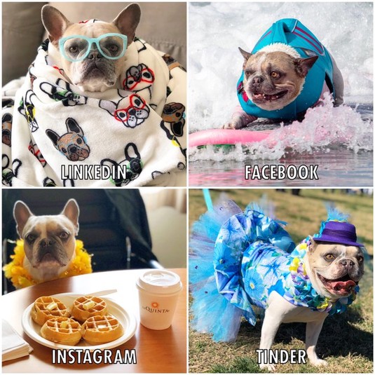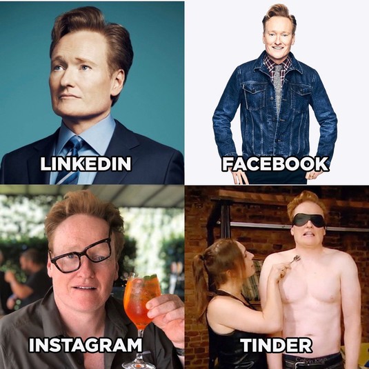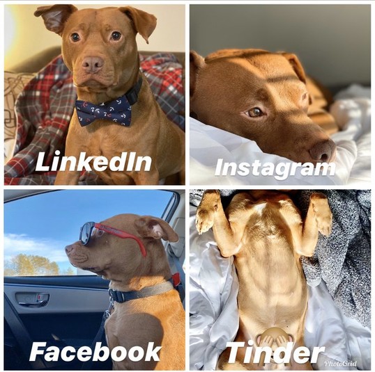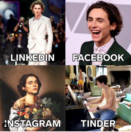 В соцсетях появился новый мем — это коллаж из четырех фотографий, каждая из которых представляет собой аватар в одной из соцсетей: LinkedIn, Facebook, Instagram или Tinder.