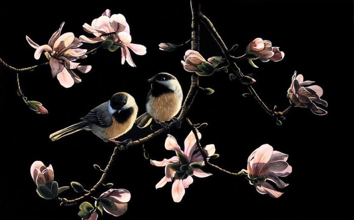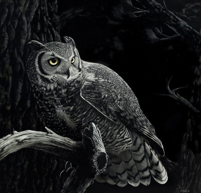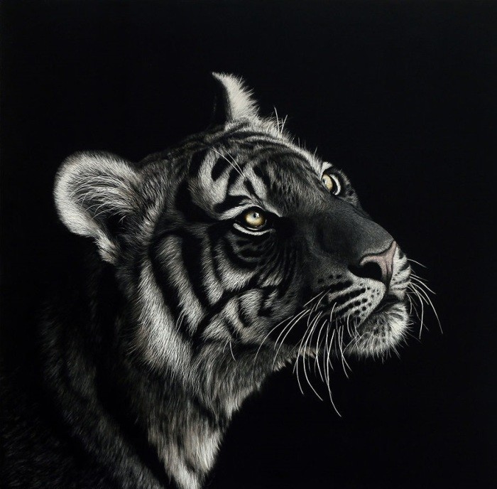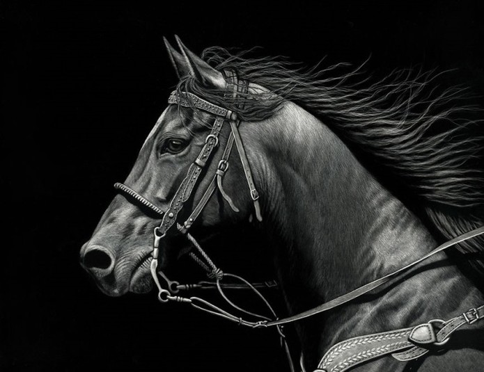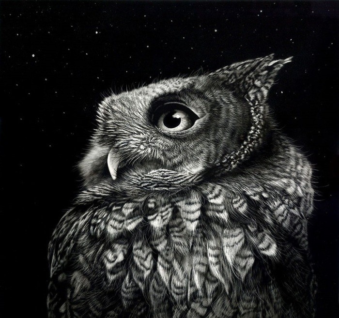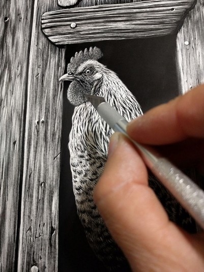 Никакой кисти и палитры! Художница свои картины не пишет, а нацарапывает самыми различными острыми предметами на поверхности, покрытой чёрными чернилами. Техника, которую использует художница называется скретчборд.