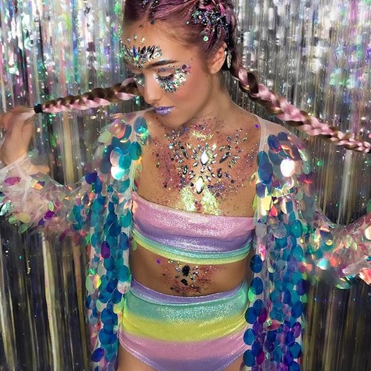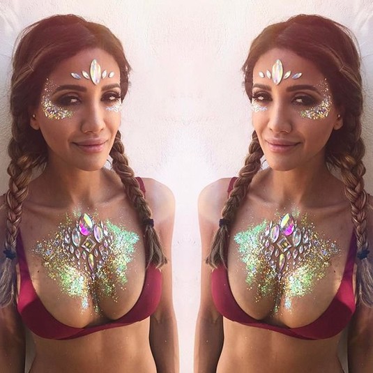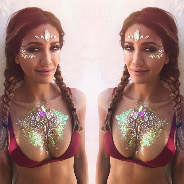 Сеть захватывает новый яркий тренд - блестящая грудь. На обнаженную грудь девушки сыплют блестки и клеят камни. Чтобы создать целостную картину, остатки тела закрашивают краской, соответствующей цвету декора.