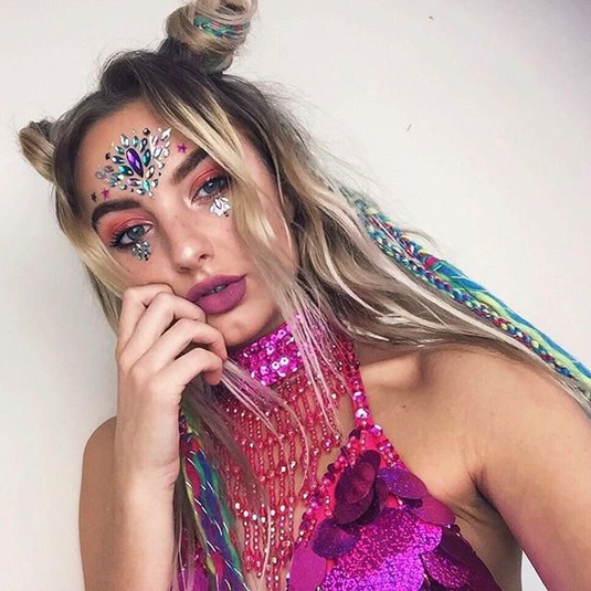 Для девушек, не желающих обнажаться, предложила наносить дизайн на зону декольте. Также для яркости автор создает миниатюрные композиции из камней на лице. Довершает образ макияж в избранных цветах с блестками.