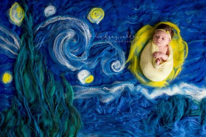Линдcи Уoлден в голову пришла гениальная идея - воссоздать из разноцветной пряжи шедевры мировой живописи, запечатлев на этих импровизированных полотнах младенцев.