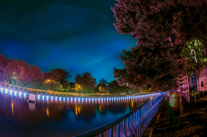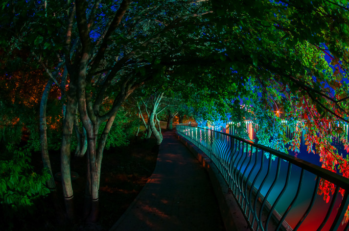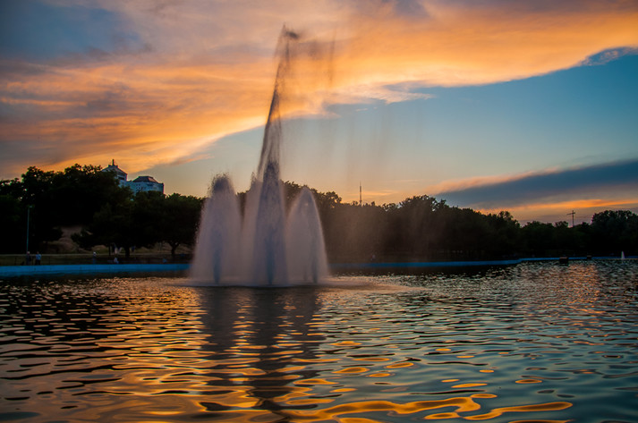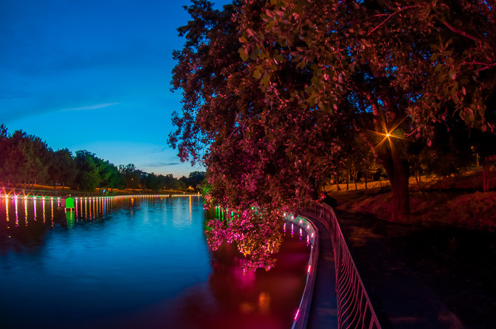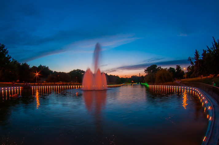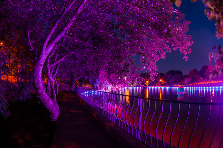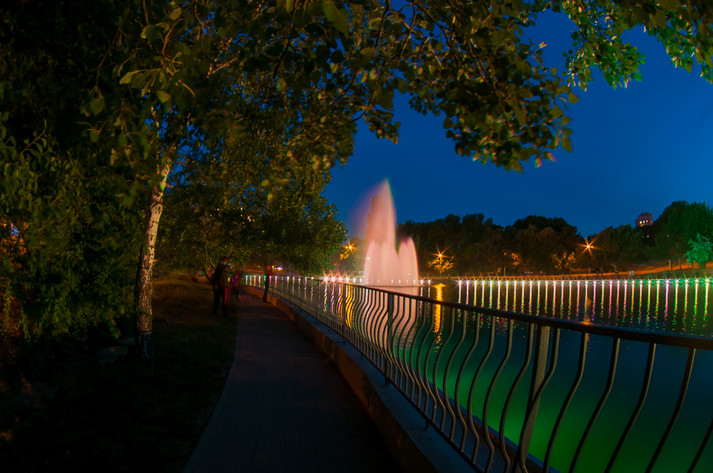 Прогуливаясь вечером в парке, люди могут наблюдать световое шоу из лампочек, установленных по всему периметру водоема еще зимой. Подсветка включается около девяти вечера, а разноцветные деревья превращают парк в сказочный мир. Фонтан начинает работать через полчаса и прекрасно дополняет романтическую атмосферу.