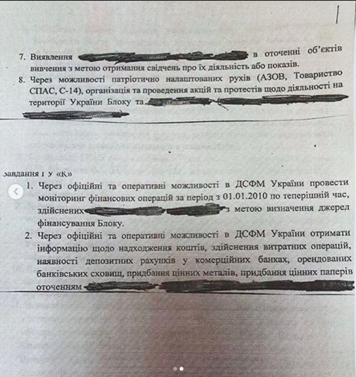 Согласно документу, Департамент защиты национальной государственности СБУ якобы получил задание установить связи, места проживания, официальные и неофициальные контакты Виктора Медведчука, а также его жены Оксаны Марченко, нардепов Шуфрича, Козака, Нимченко, Загороднего, Колтуночива, Волошина, Чубирка и других.