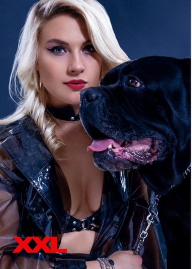 На снимках спортсменка позирует в строгом белье, а иногда и без него, прикрывая грудь руками и курткой. Также в кадре с Ольгой оказались две черных собаки, которых она держит на поводке.