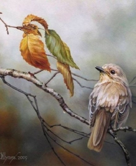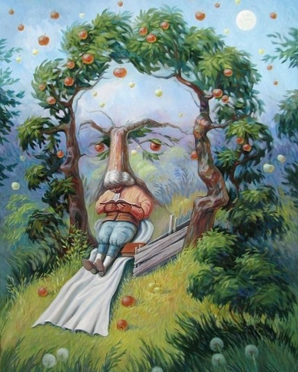 На фоне пасторального пейзажа буквально проявляется человеческое лицо, или же рядом с птицей на ветке «сидит» еще одна, только из листьев.