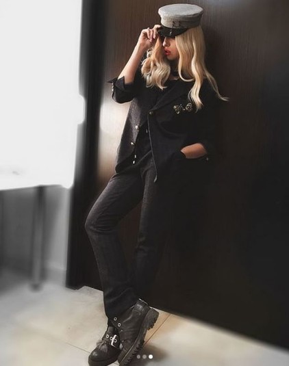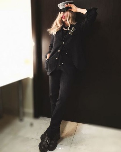 Стилисты артистки выбрали черный костюм, украшенный элегантной брошью. Образ суперблондинка дополнила серым Кэппи от дизайнера Руслана Багинского и обувью с толстой подошвой.