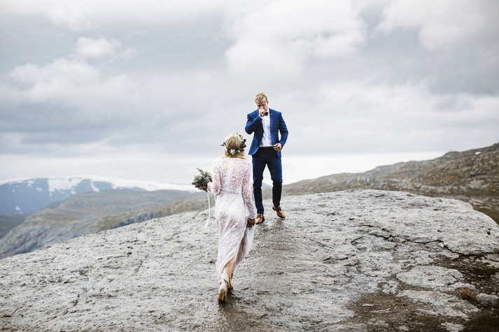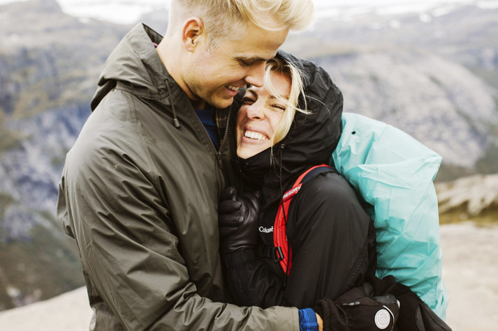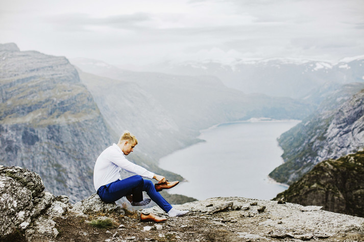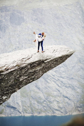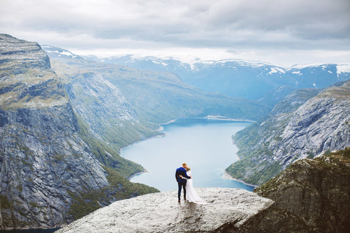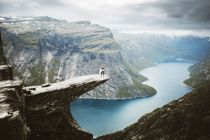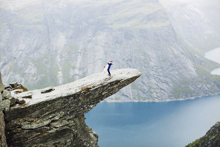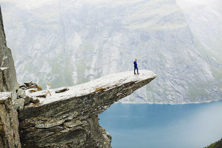 Вернуться к этой идее им удалось лишь спустя два года и в совершенно другом месте. Чтобы снимки получились более зрелищными, они отправились из США в Норвегию. Там они отыскали восхитительное место на отвесной скале, которая возвышается над озером. Захватывающий пейзаж стал удивительным фоном для снимков двух влюбленных.