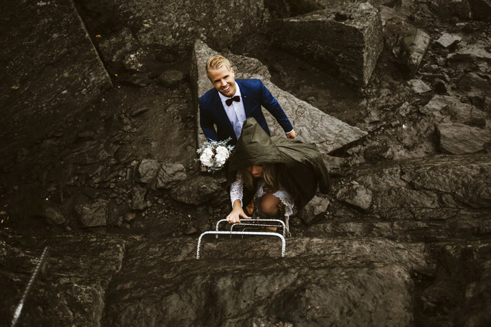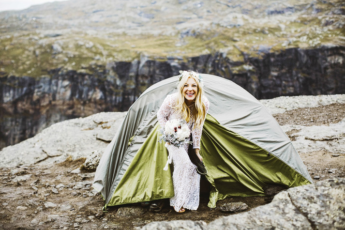 Герои снимков отмечают, что это место находится в отдалении от цивилизации, так что им пришлось отправиться в настоящий поход, чтобы взобраться на скалу. При этом свадебные костюмы они взяли с собой в рюкзаках. Переодеваться им пришлось просто в палатке, а делать макияж просто сидя на камне.