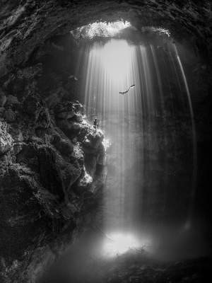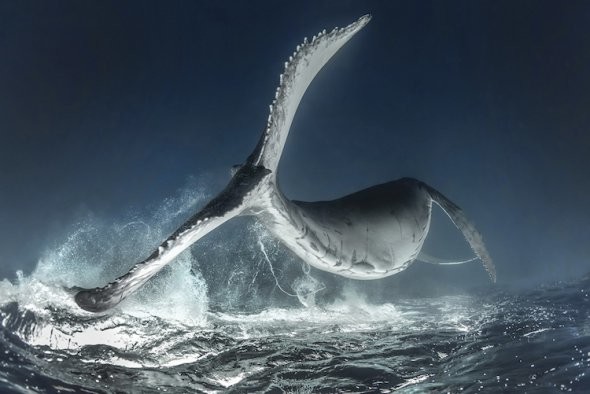 «Проведя весь день в поисках китов, нашу лодку настигла волшебная встреча с любопытной матерью и телёнком... Здесь я попытался создать уникальную перспективу, перевернув изображение вверх тормашками, чтобы было похоже, что кит парит над поверхностью».