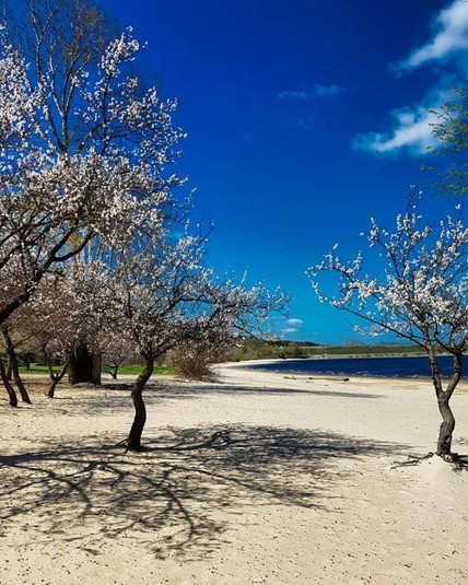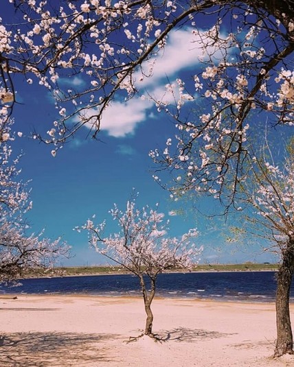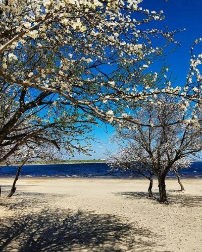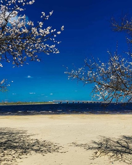 Снимки широко разошлись по сети благодаря тому, что в них удивительно сочетается теплый песок, вода, синее небо и нежный весенний цвет