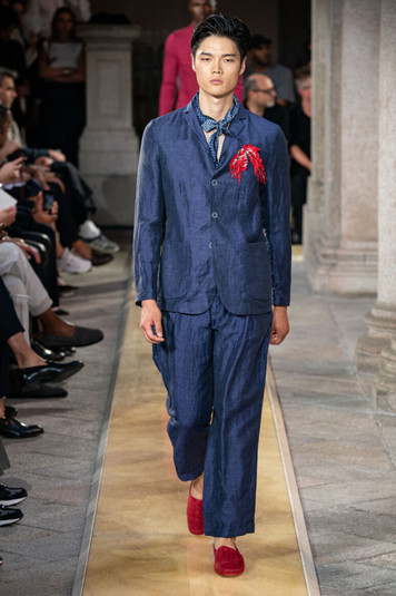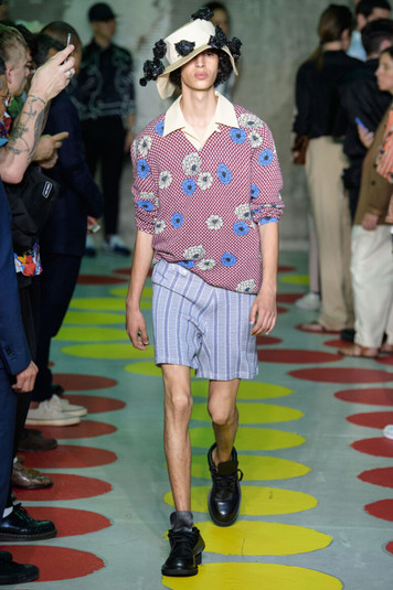 В новой мужской коллекции Marni смешалось множество разных настроений: графические принты на официальных костюмах, залитые мазками брюки и топы, яркие ансамбли из кашемира в комбинации с пластиком и парчой. Модели на подиуме Marni выглядели, как краснокнижные птицы со сказочным оперением. Шарма коллекции добавляли детали, созданные современными художниками.