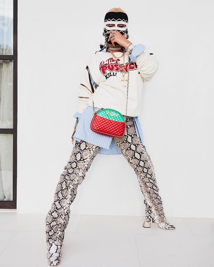 Эпатажный образ звезда дополнила полосатой рубашкой, теплым свитером и приталенными брюками со змеиным принтом. Также певица использовала десятки колец, браслетов, а также прочих аксессуаров.