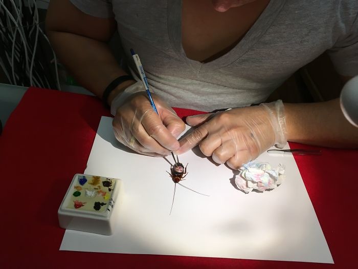 После таких манипуляций тараканы готовы для нанесения рисунка. Чтобы изобразить малейшие детали портретов, художник использует масляную краску и маленькую кисть. Но сделать это непросто, ведь спина насекомых очень маленькая и гладкая.
