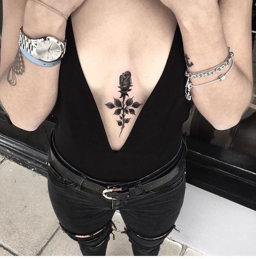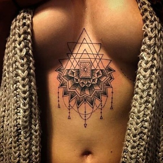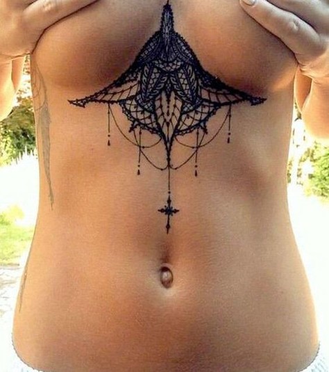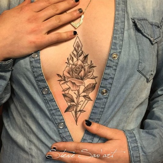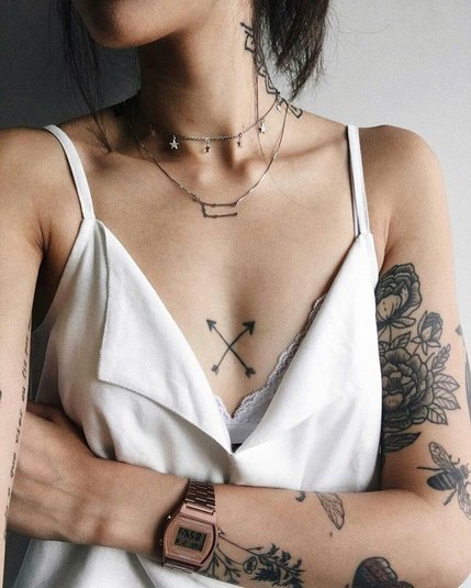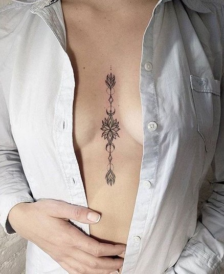 Напомним, женщины нечасто делают тату на груди. Отчасти это связано с болевыми ощущениями, поэтому некоторые предпочитают наносить рисунок под грудью или же посредине, что также позволяет скрывать тату при необходимости.