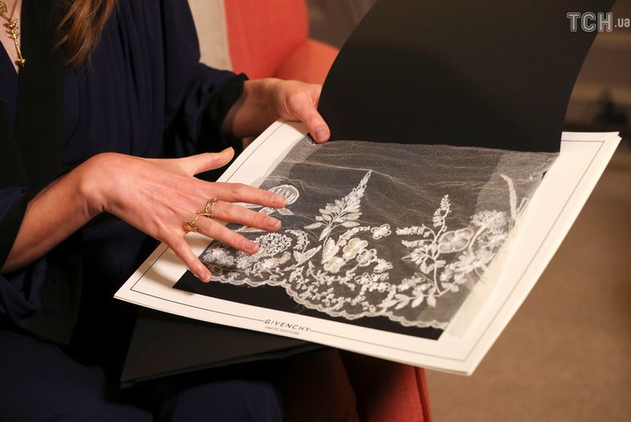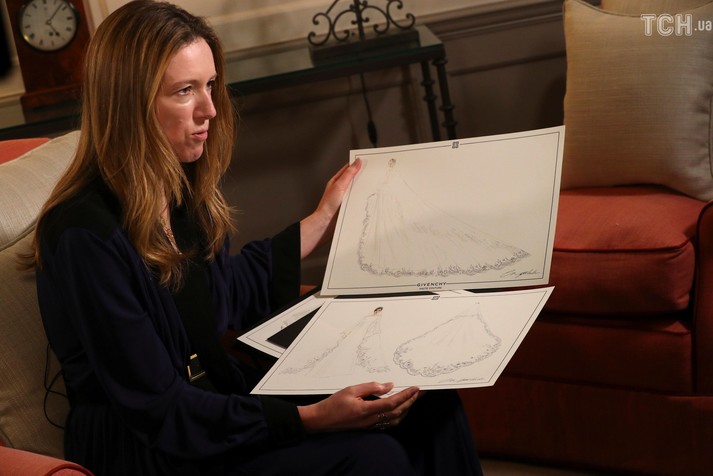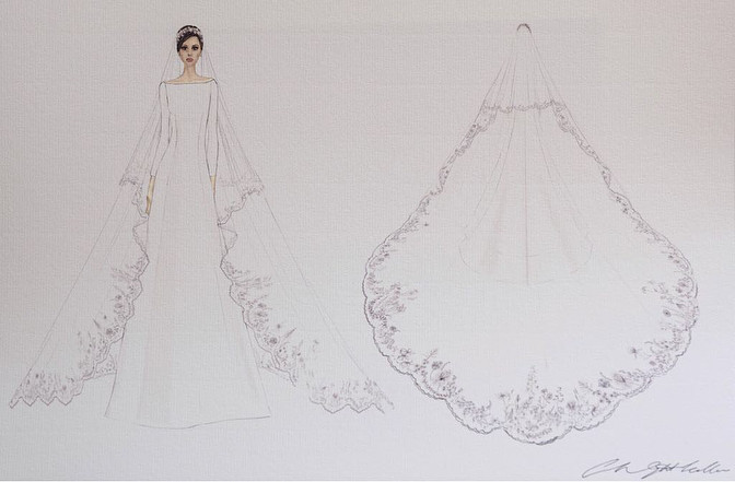 Дизайнер представила оригинальные эскизы платья Меган. По словам Келлер, роскошная фата жены принца Гарри была выполнена из шелкового тюля с отделкой из ручной вышивки.
